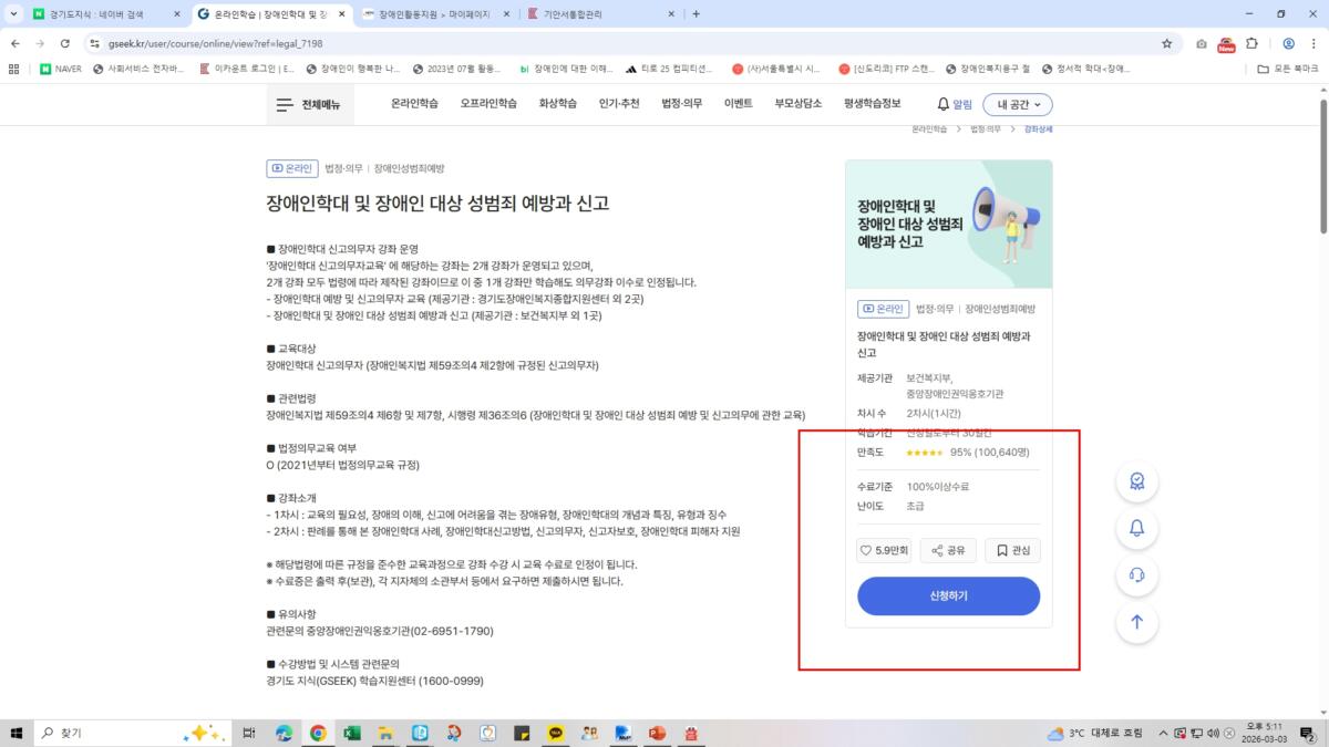 3월 법정의무 교육은 2026년 장애인학대 및 장애인 대상 성범죄 예방 및 신고 의무 입니다.