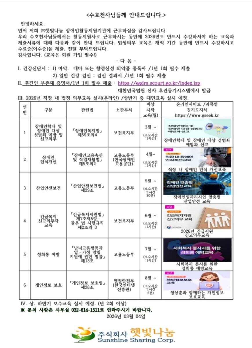 2026년 법정의무교육 수강 과목 안내드립니다 2026년 안으로 모두 수강 완료하여야 합니다.
