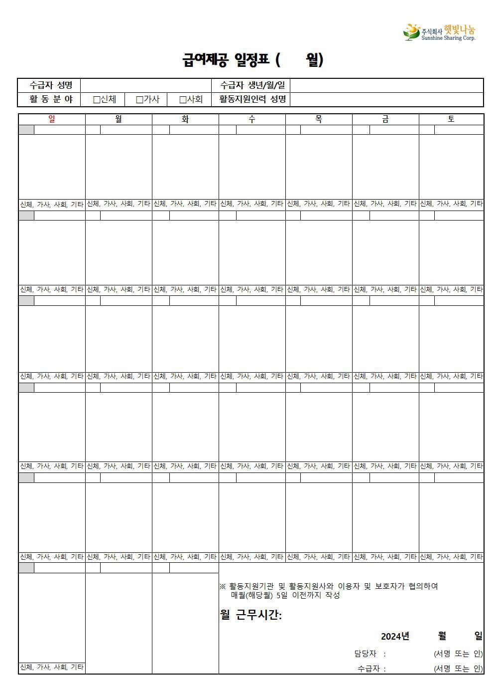 홈커뮤니티갤러리장애인활동지원 장애인활동지원 2024년 6월 급여제공일정표 작성자 Admin 작성일 2024-05-07 01:31 조회 680 안녕하세요.06월 급여제공 일정표 첨부드립니다.감사합니다. 일정표 양식이 변경되었습니다! 문의사항은 기관 및 전담인력들에게 문의 부탁드리겠습니다. 좋아요 1 싫어요 0 인쇄 j17153063751933_2024년_급여제공_일정표(휴게시간).hwp 전체 0 추천순 작성순 최신순 작성자 비밀번호 사진 첨부파일 « 5월 월례회의 안내 [활동지원팀] 2차 법정의무교육 (산업안전보건교육) 이수방법 안내 » 목록보기 답글쓰기 글수정 글삭제 Powered by KBoard